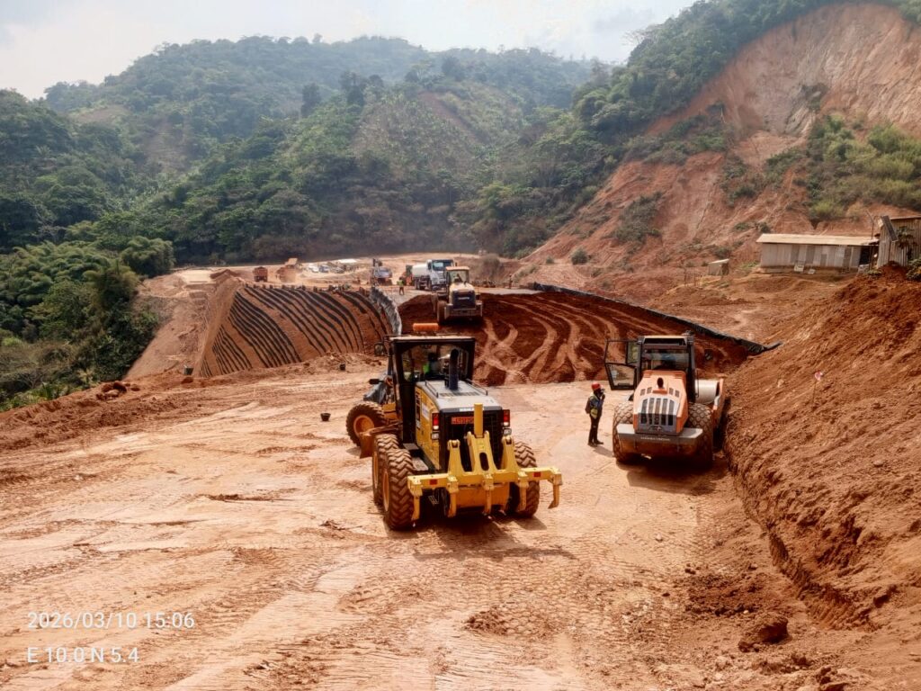 Après la mission d’évaluation conduite le 26 février 2026 par les Directeurs Généraux des Travaux Publics et des Études Techniques du Ministère des Travaux Publics, les équipes ont poursuivi la mise en œuvre du remblai renforcé. Les matériaux latéritiques continuent d’être acheminés depuis les sites d’emprunt, mis en dépôt provisoire avant leur mise en place par couches successives, suivie des opérations de scarification, de dessiccation et de recompactage.Dans le même élan, l’approvisionnement du chantier se poursuit avec l’arrivée de nouveaux géosynthétiques destinés au renforcement des remblais et de géogrilles supplémentaires. Les équipes ont également procédé au levé topographique de la voie de contournement et au façonnage des aciers destinés à la fosse triangulaire.Nonobstant cette mobilisation, certaines activités connaissent des ralentissements liés à l’attente de l’intervention d’un sous-traitant, ce qui entraîne des arrêts ponctuels sur certaines séquences du chantier, alors que la période de retour des pluies approche.